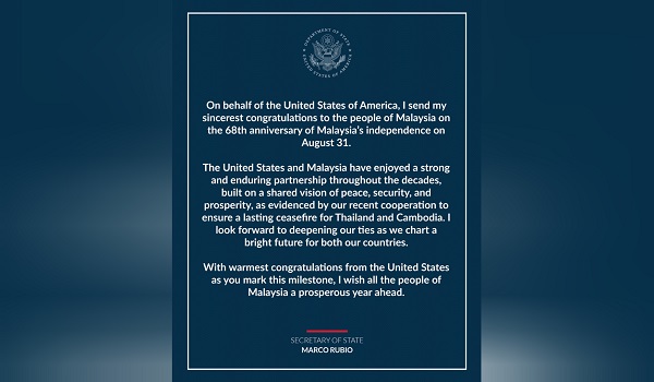 Setiausaha Negara AS,Marco Rubio berkata hubungan dua hala antara kedua-dua negara kekal kukuh sejak beberapa dekad lalu,berasaskan nilai keamanan,keselamatan dan kemakmuran bersama.